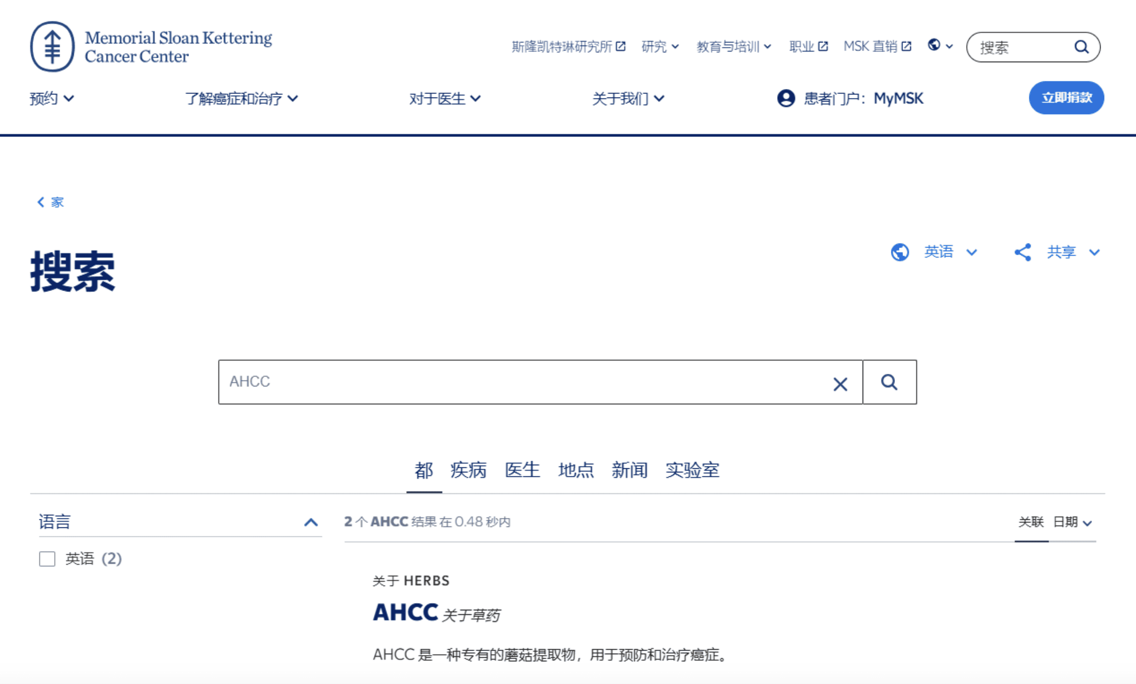 ——AHCC是美国纪念斯隆凯特琳癌症中心(MSK,全美排名第二)推荐给医生使用的仅有几种辅助治疗用菌之一。